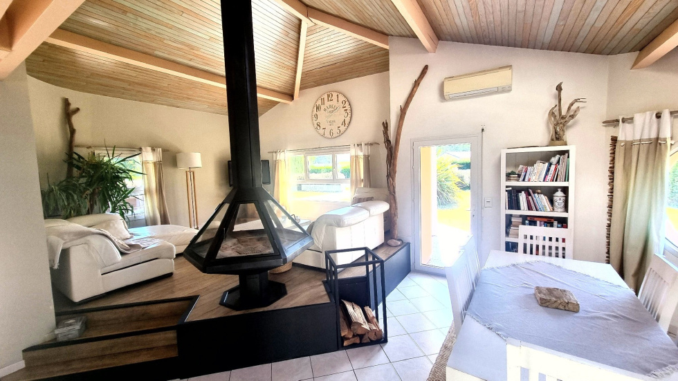 Laissez-vous séduire par cette belle maison à l’architecture unique, pensée pour vivre au rythme des saisons.L’été, vous profitez d’un véritable esprit vacances : grande terrasse avec salon extérieur, piscine entourée de sa plage et ambiance conviviale.L’hiver, la chaleur du foyer se retrouve autour de la cheminée centrale, qui diffuse une atmosphère cocooning et familiale. À l’intérieur, la maison offre : Une entrée avec placard, Une cuisine ouverte sur la salle à manger, Un salon en hauteur baigné de lumière, Trois chambres avec rangements, Une salle d’eau rénovée avec douche à l’italienne et meuble double vasque, WC séparés, Un cellier pratique. À l’extérieur : Un porche pouvant accueillir une voiture, Un garage fermé, Une dépendance et un local technique, Une piscine et sa plage pour des moments de détente. Atouts supplémentaires : forage avec arrosage intégré, système de chauffage mixte (bois, électrique, pompe à chaleur), chauffe-eau solaire. Un bien rare à Lit-et-Mixe, idéal comme résidence principale ou maison de vacances, alliant confort moderne et charme chaleureux.