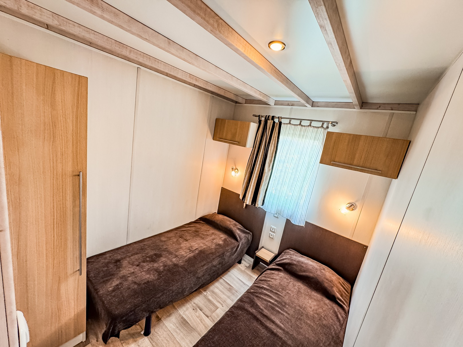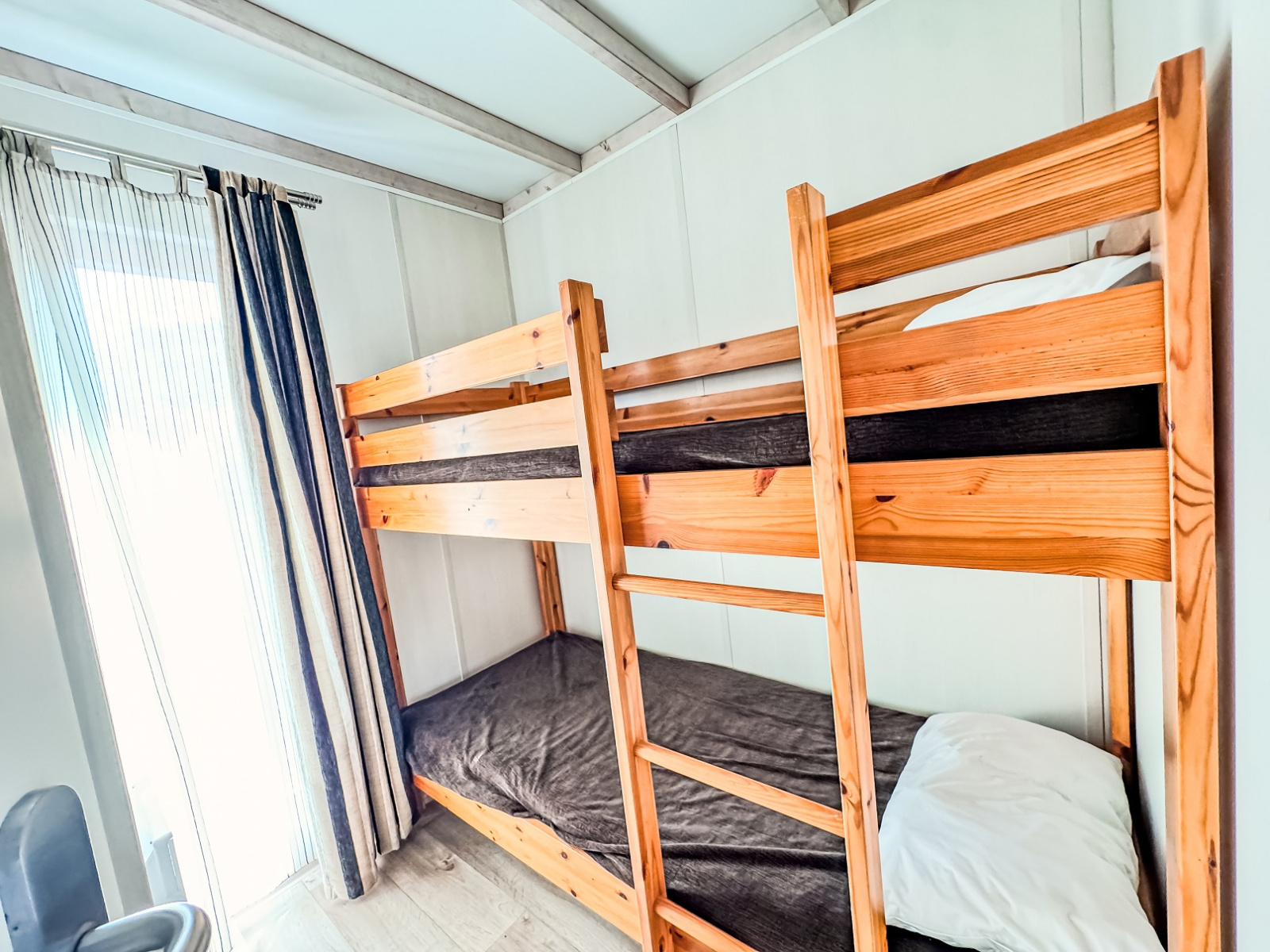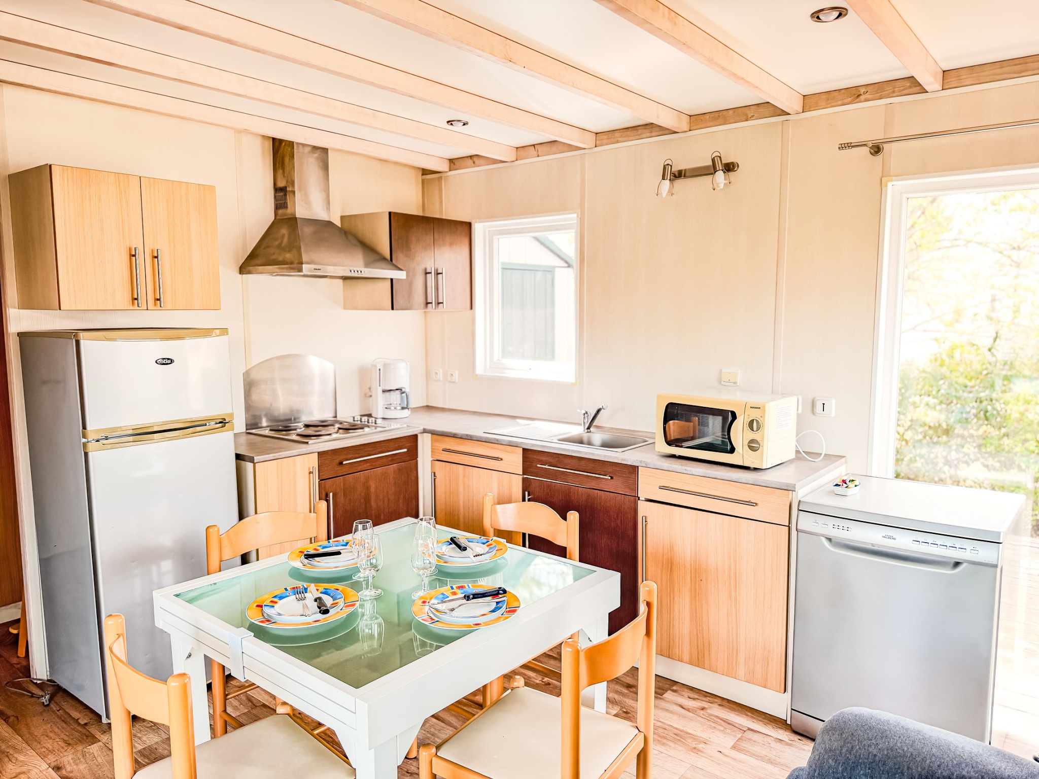 Ce chalet tout confort d'environ 32 m² dispose d'une terrasse couverte et d'un terrain de 200 m² non clos. Il comprend un séjour avec cuisine équipée, 3 chambres offnt 1 lit double, 2 lits simple et lits superposés, une salle d'eau et des WC séparés.