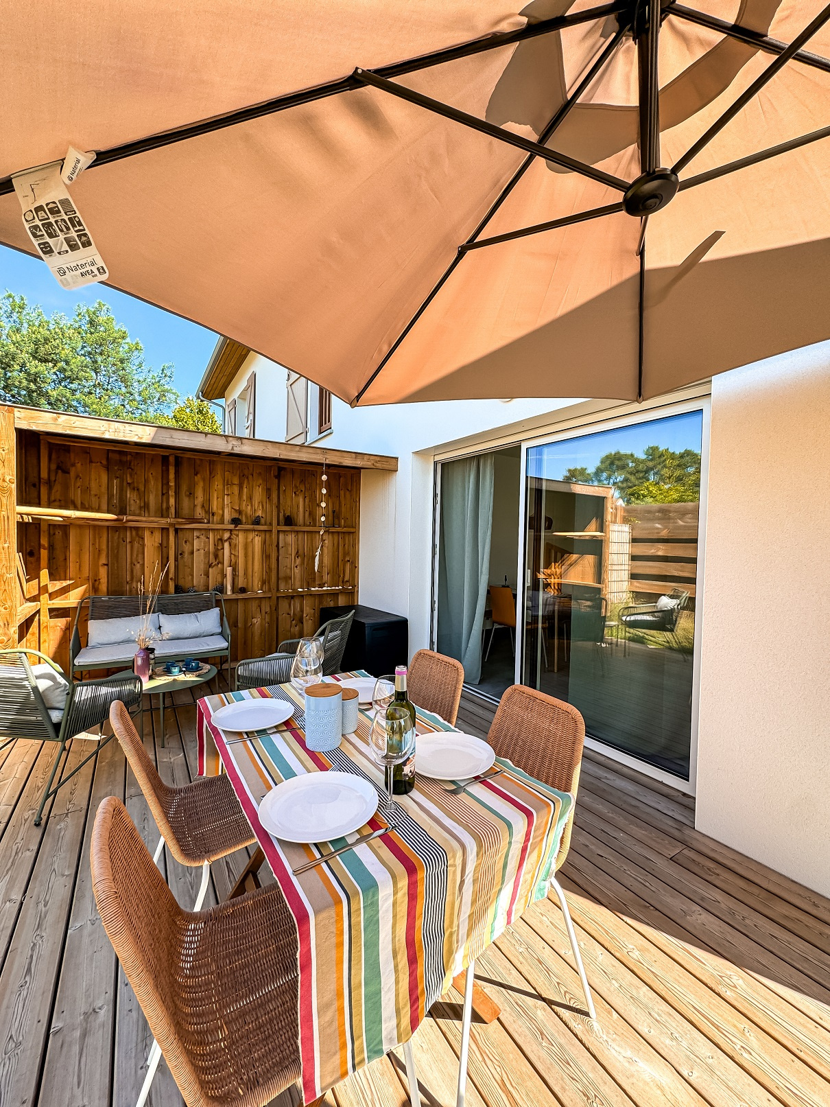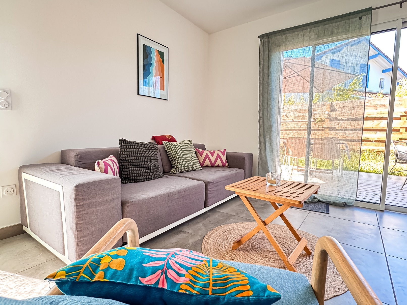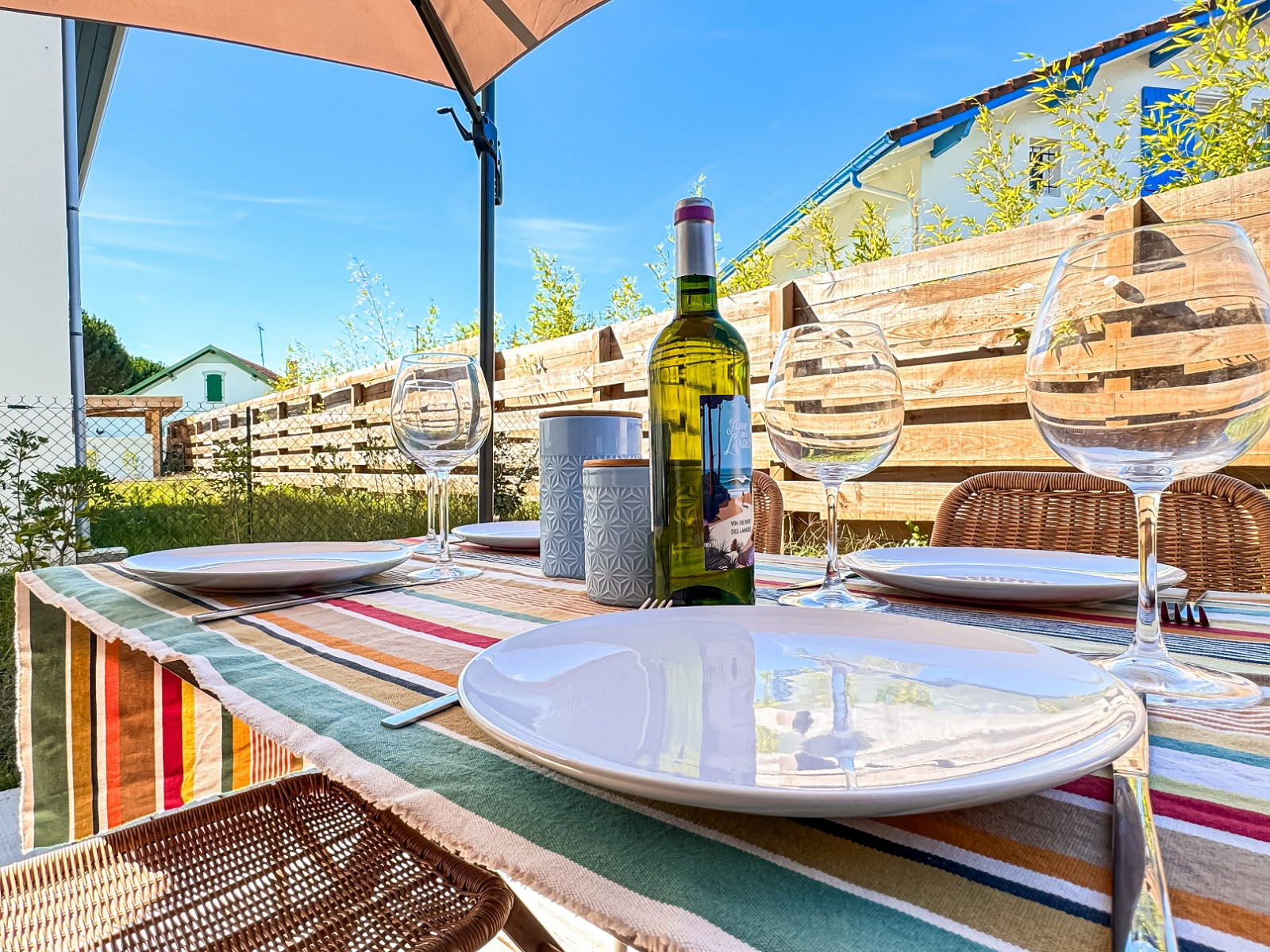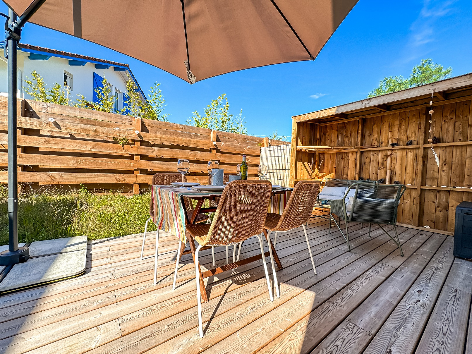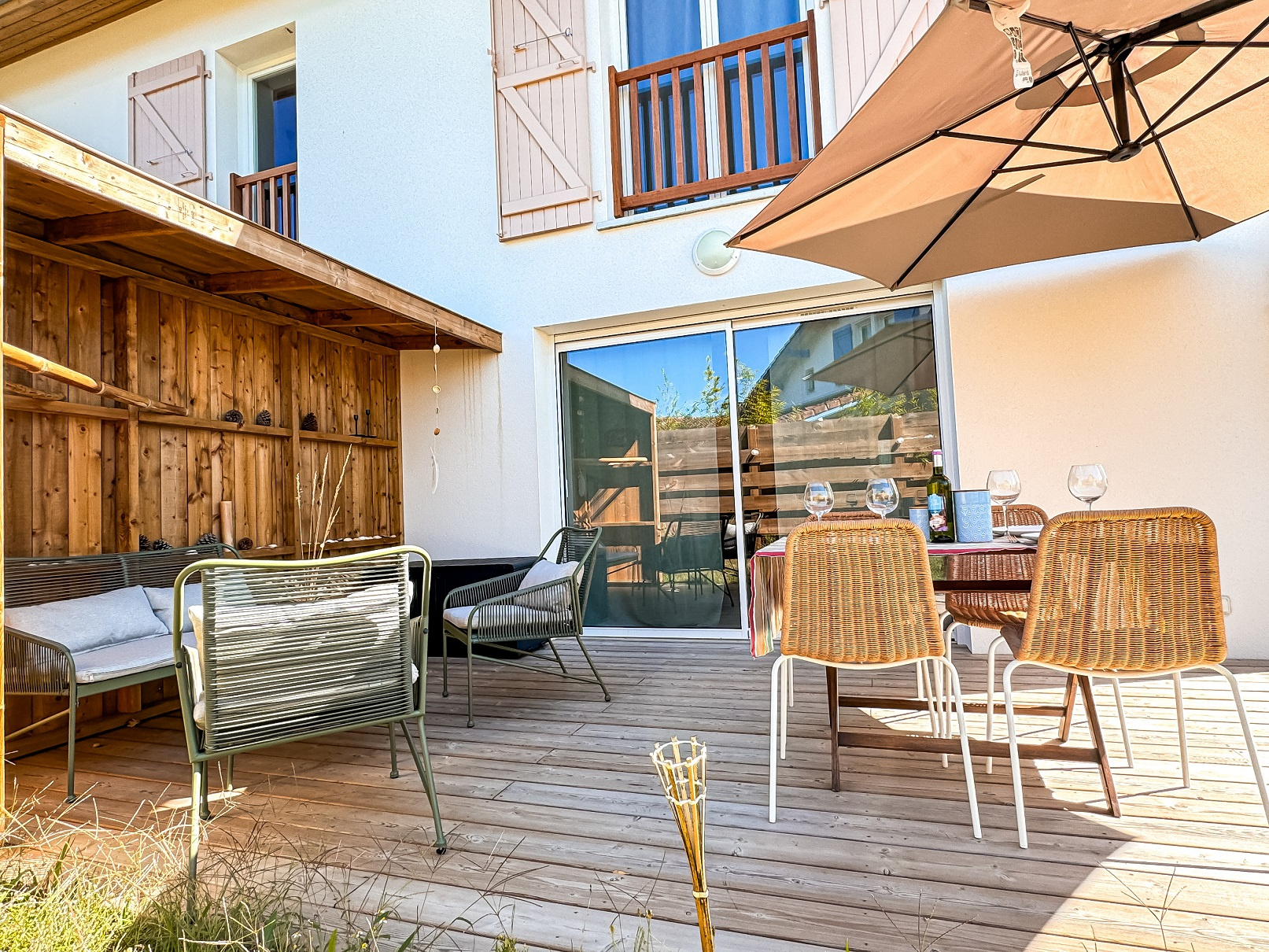 Maison neuve en duplex, mitoyenne d'un côté, au cœur du village de Lit et Mixe tout en étant au calme, idéale pour une famille de 4 personnes. Vous entrez sur une cuisine équipée (machine à café, bouilloire, plaque, four, réfrigérateur/congélateur, lave-vaisselle) et ouverte sur la pièce de vie. La grande baie vitrée donnant sur une agréable terrasse en bois et son jardin apporte une ambiance lumineuse et chaleureuse au lieu. Une salle d'eau avec WC et une buanderie complètent ce rez-de-jardin. A l'étage, 2 chambres et une salle de bain avec WC. Les finitions sont soignées et le mobilier sélectionné avec goût contribueront à vous y sentir comme chez vous. Détendez-vous dans le salon extérieur, propice au repos.