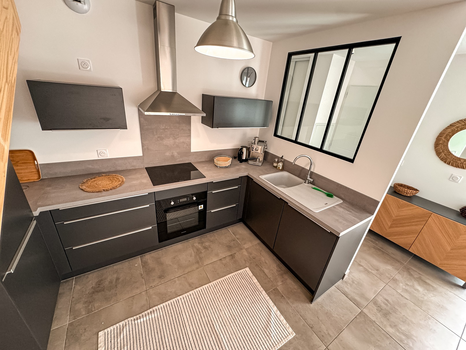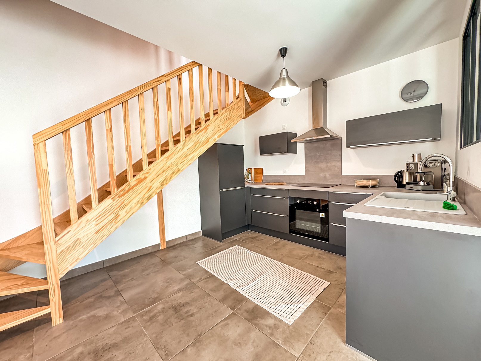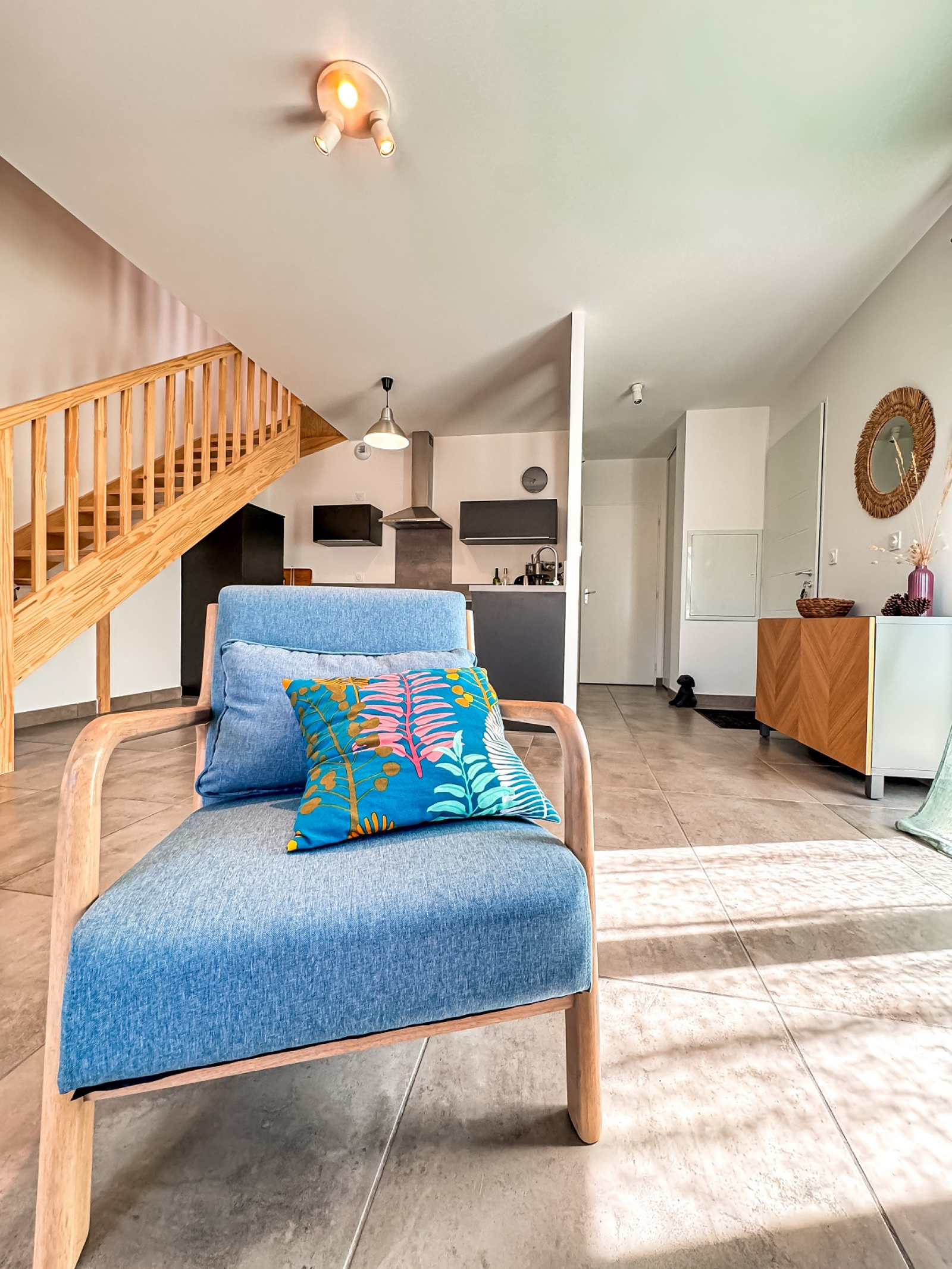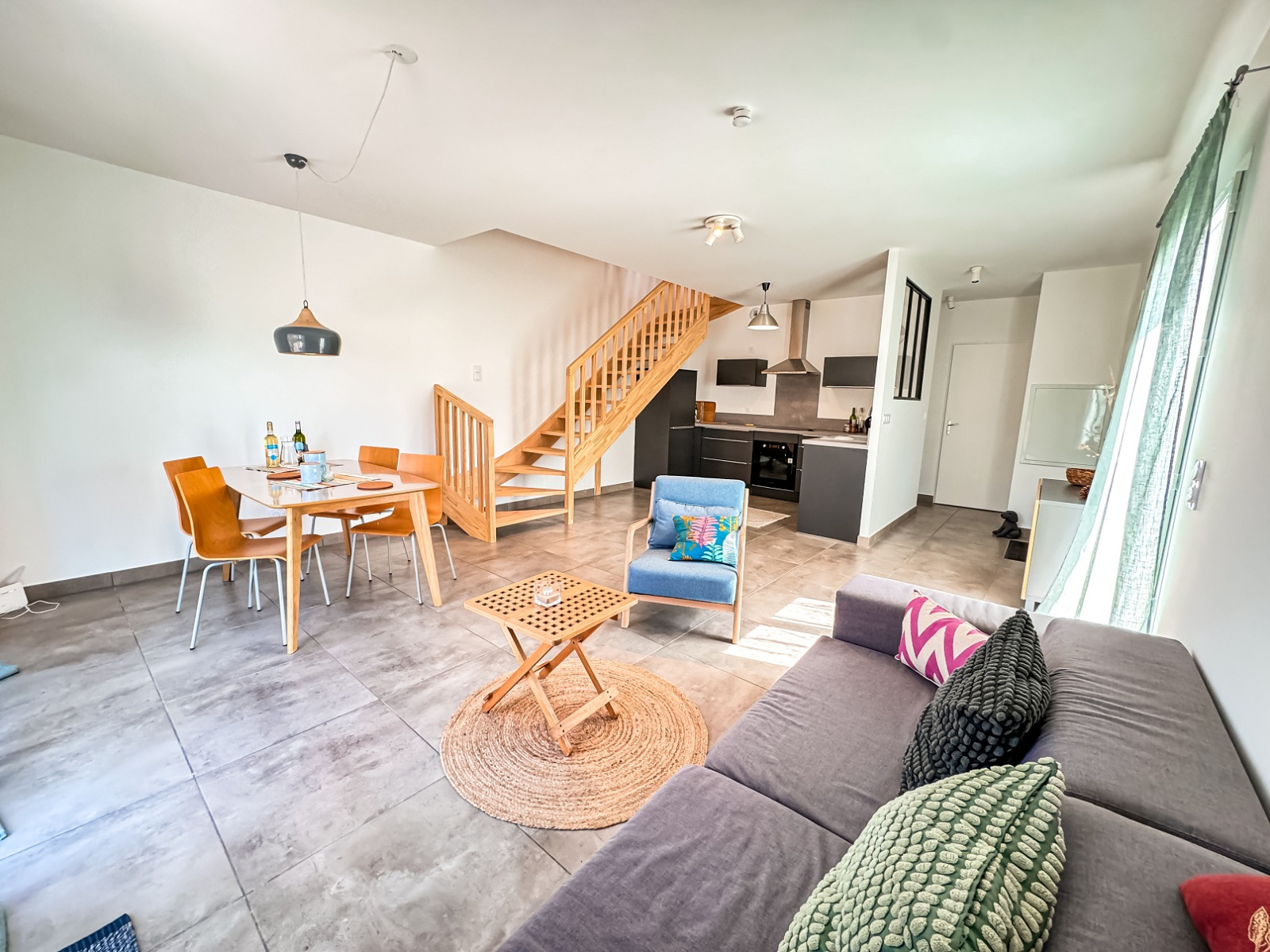 Maison neuve en duplex, mitoyenne d'un côté, au cœur du village de Lit et Mixe tout en étant au calme, idéale pour une famille de 4 personnes. Vous entrez sur une cuisine équipée (machine à café, bouilloire, plaque, four, réfrigérateur/congélateur, lave-vaisselle) et ouverte sur la pièce de vie. La grande baie vitrée donnant sur une agréable terrasse en bois et son jardin apporte une ambiance lumineuse et chaleureuse au lieu. Une salle d'eau avec WC et une buanderie complètent ce rez-de-jardin. A l'étage, 2 chambres et une salle de bain avec WC. Les finitions sont soignées et le mobilier sélectionné avec goût contribueront à vous y sentir comme chez vous. Détendez-vous dans le salon extérieur, propice au repos.