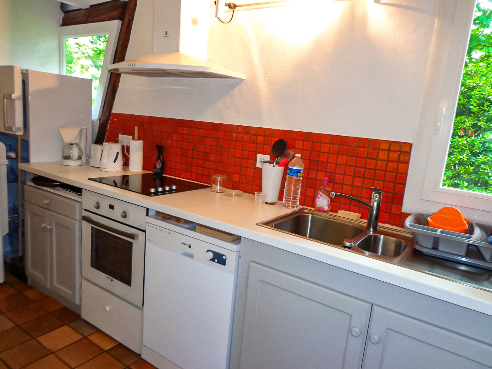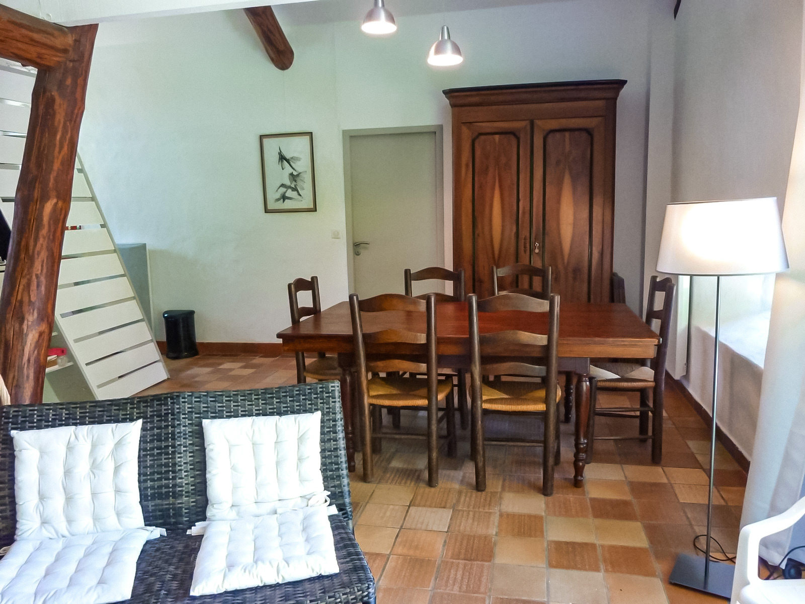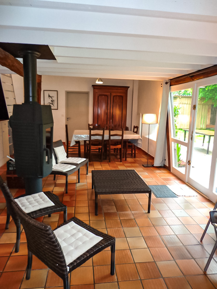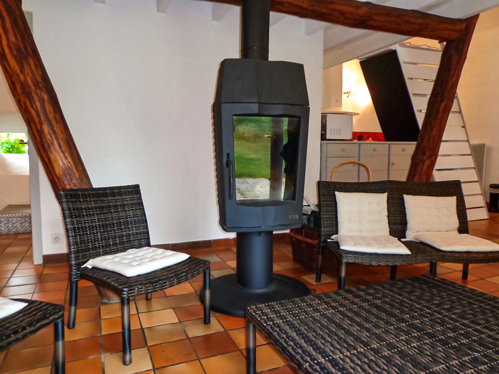 Grand séjour avec poêle à bois,salonTV,accès internet illimité gratuit. Cuisine entièrement équipée.