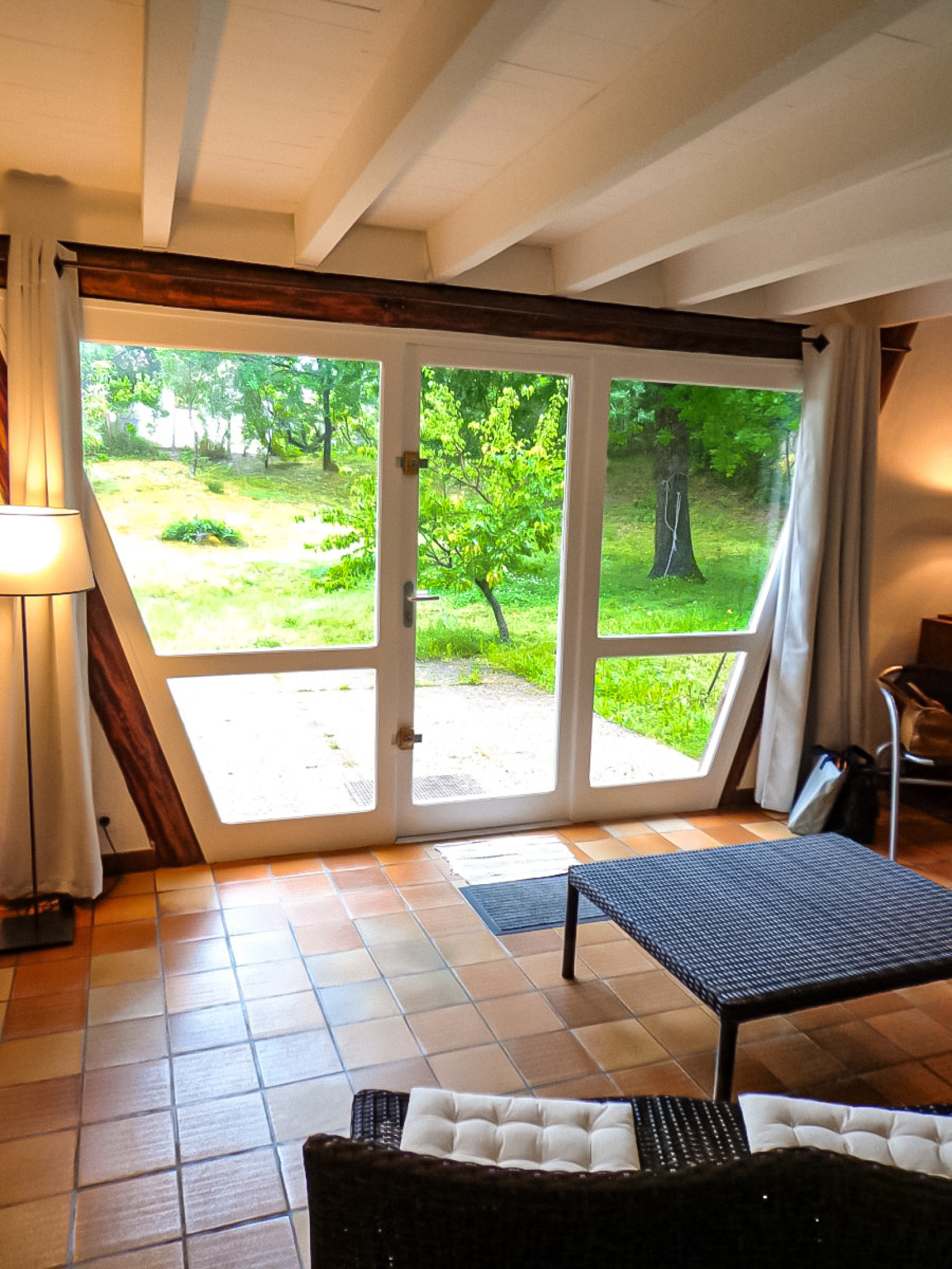 Grande terrasse plein sud avec salon de jardin et chaises longues.