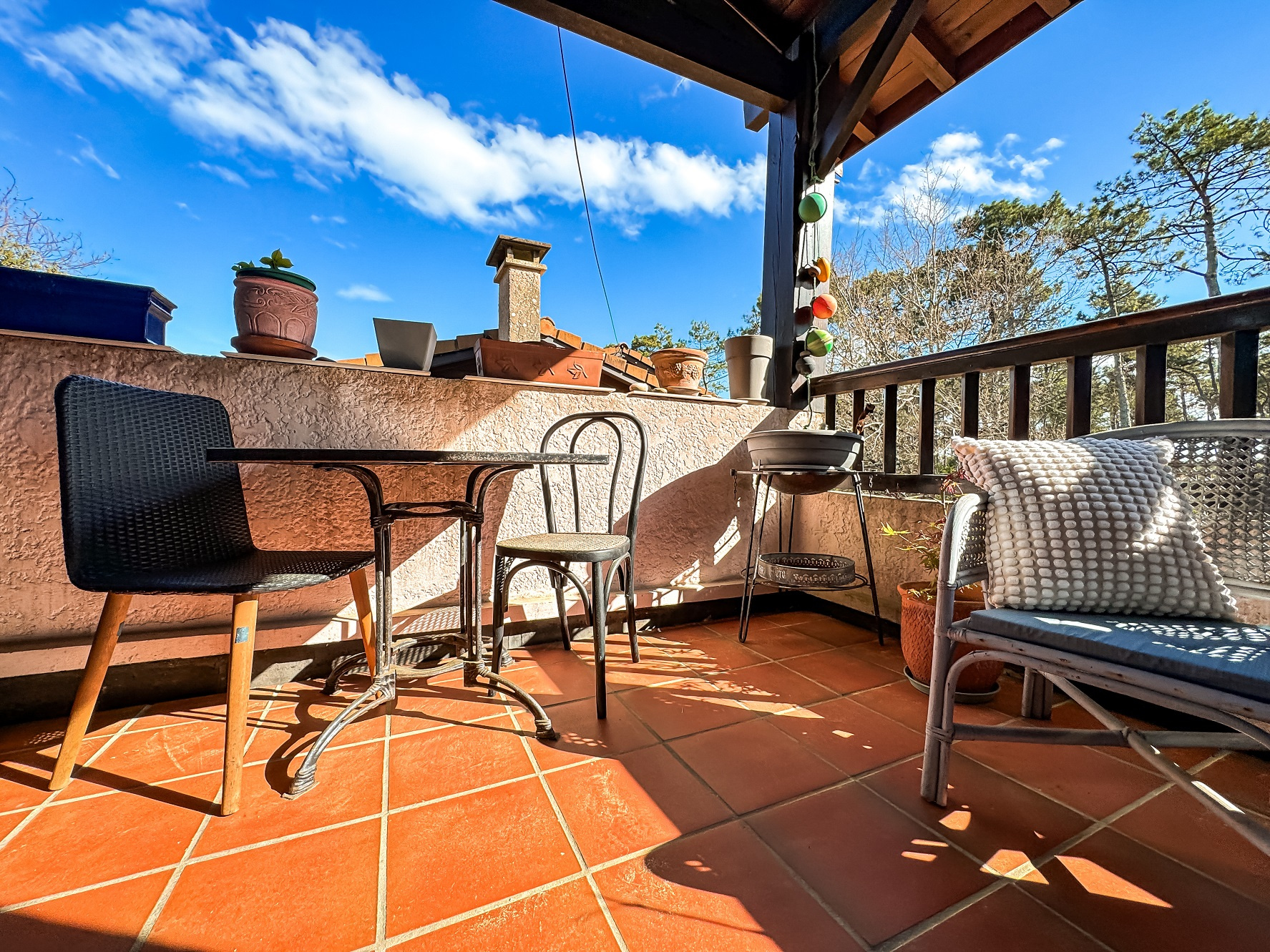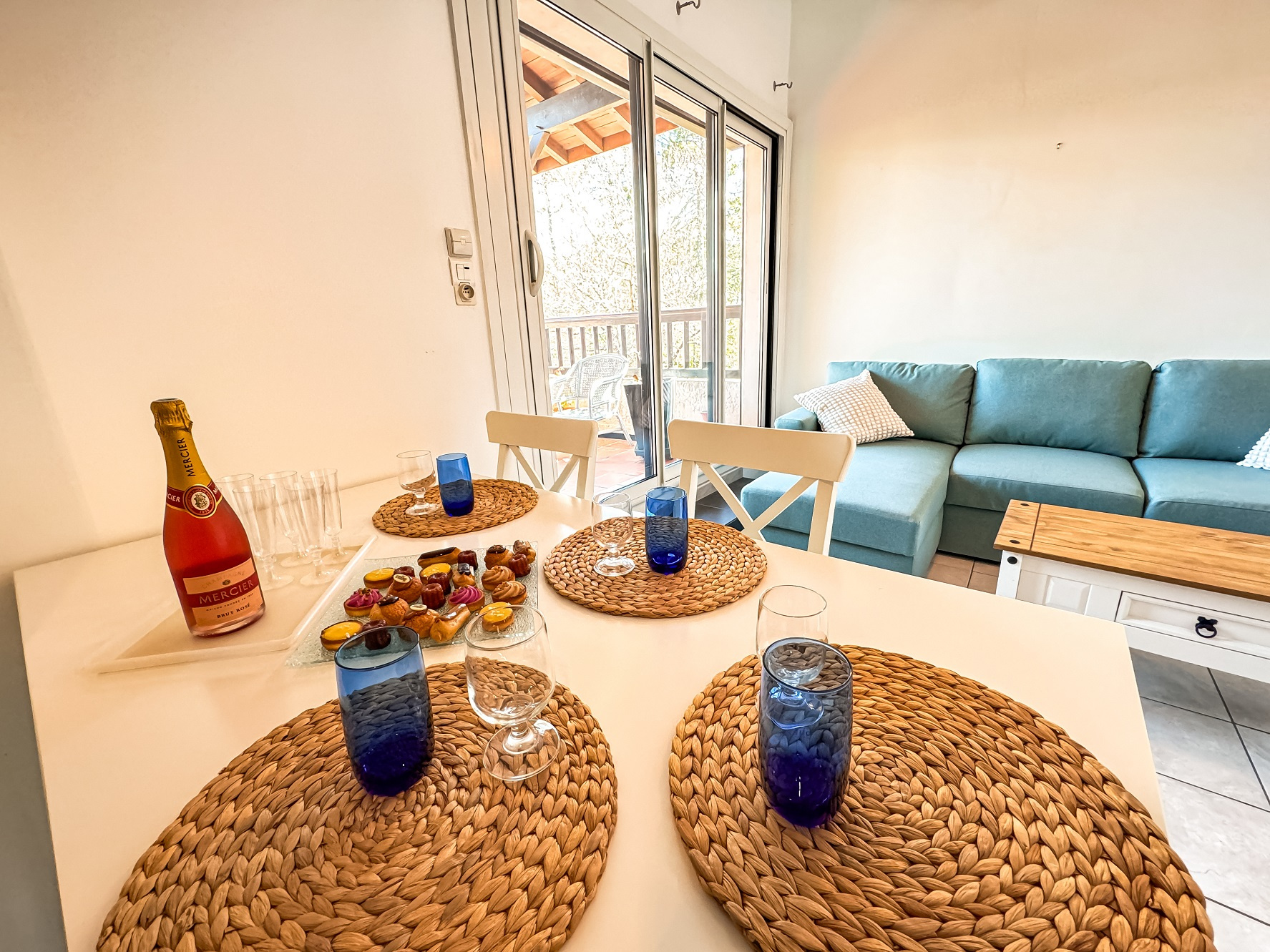 Terrasse privative ensoleillée pour profiter pleinement de vos vacances dans ce salon de jardin et place de stationnement à disposition. Résidence avec terrain de tennis, navette gratuité l'été pour vous amener directement à la plage et piste cyclable devant la résidence.