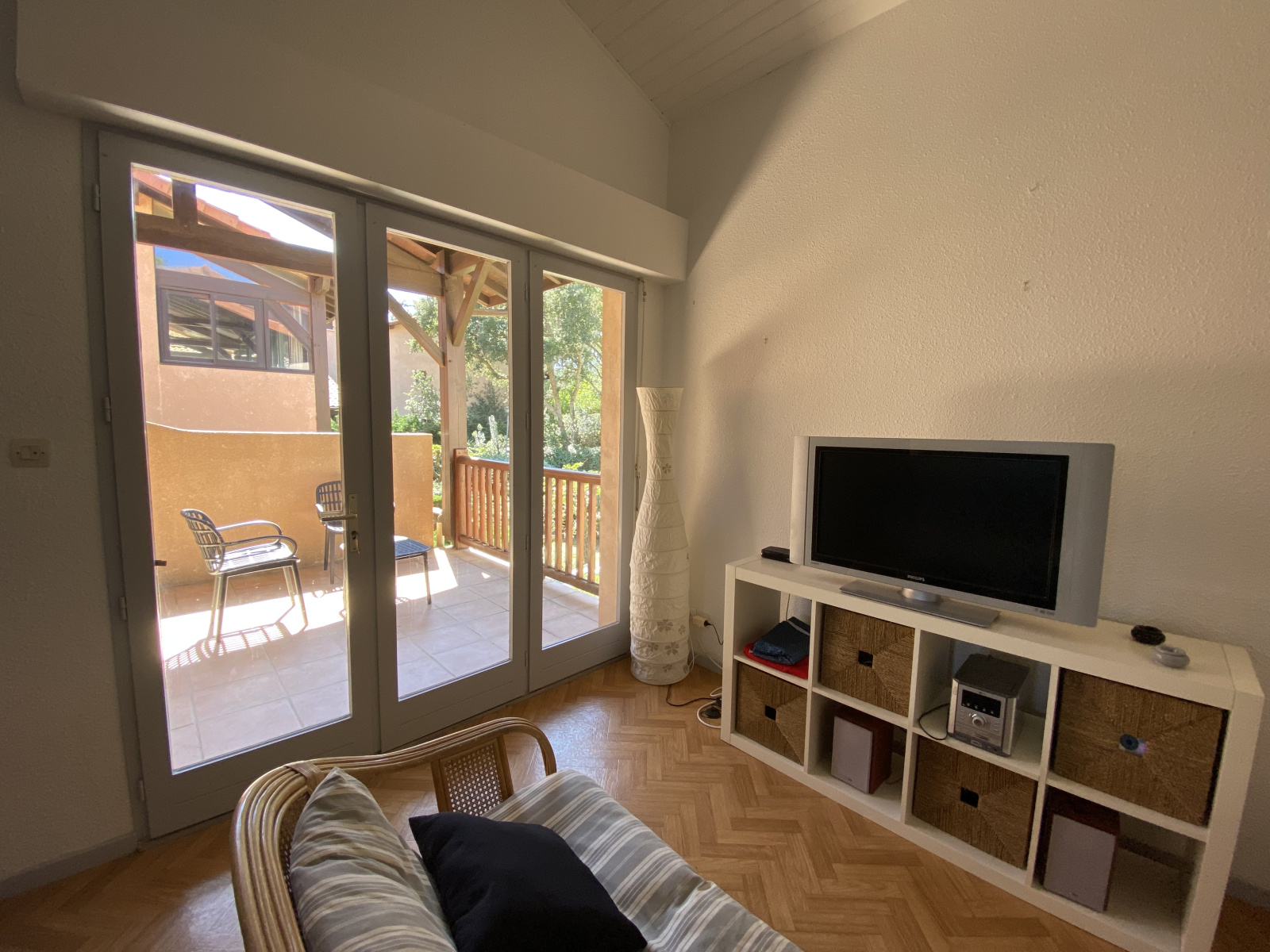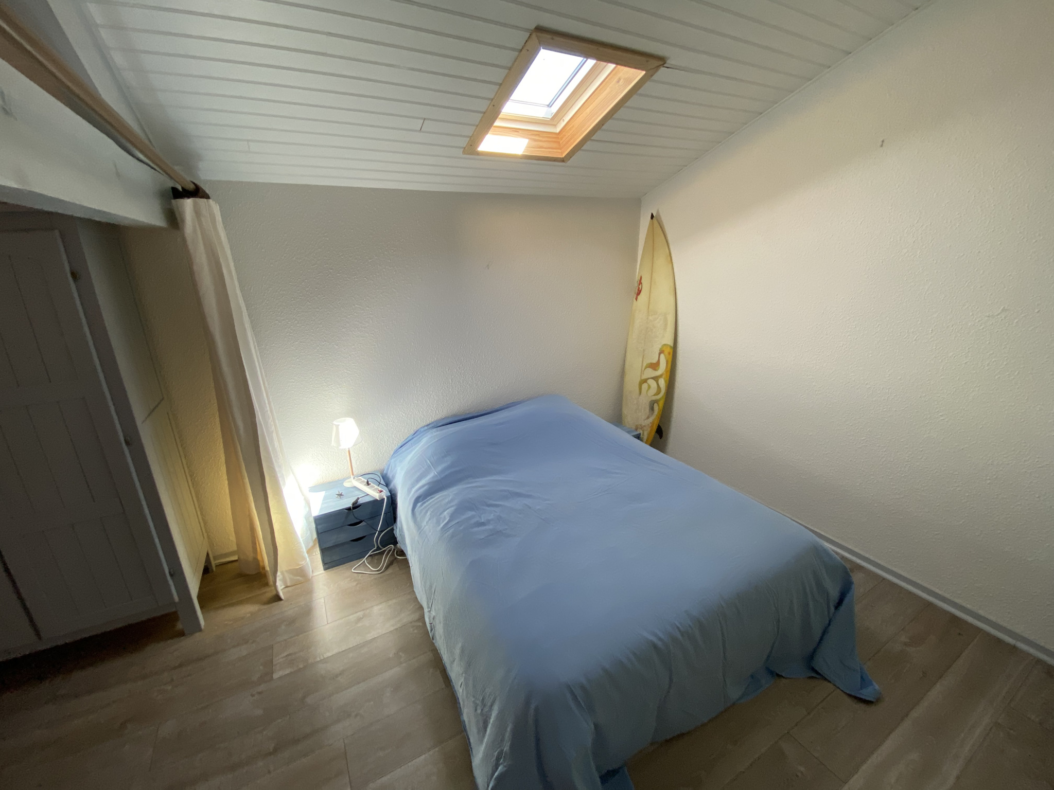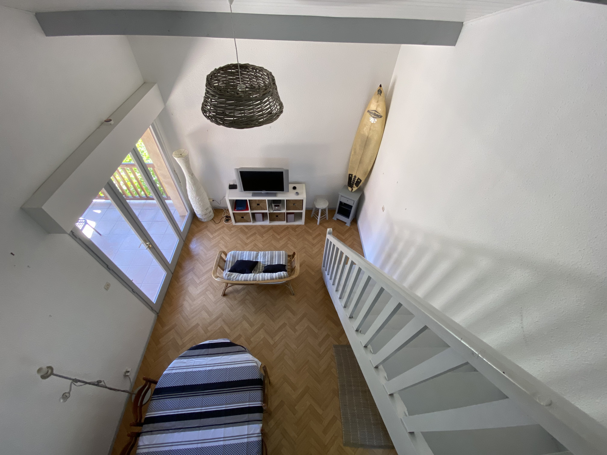 CONTIS PLAGE, résidence Hameau du Pont Rose. Appartement au premier étage en très bon état composé au rez-de chaussée d'une pièce de vie avec kitchenette, une chambre avec lit en 140, une salle d'eau et WC. A l'étage, une mezzanince avec deux lits en 140. Terrasse privative. Place de stationnement. Résidence avec tennis.