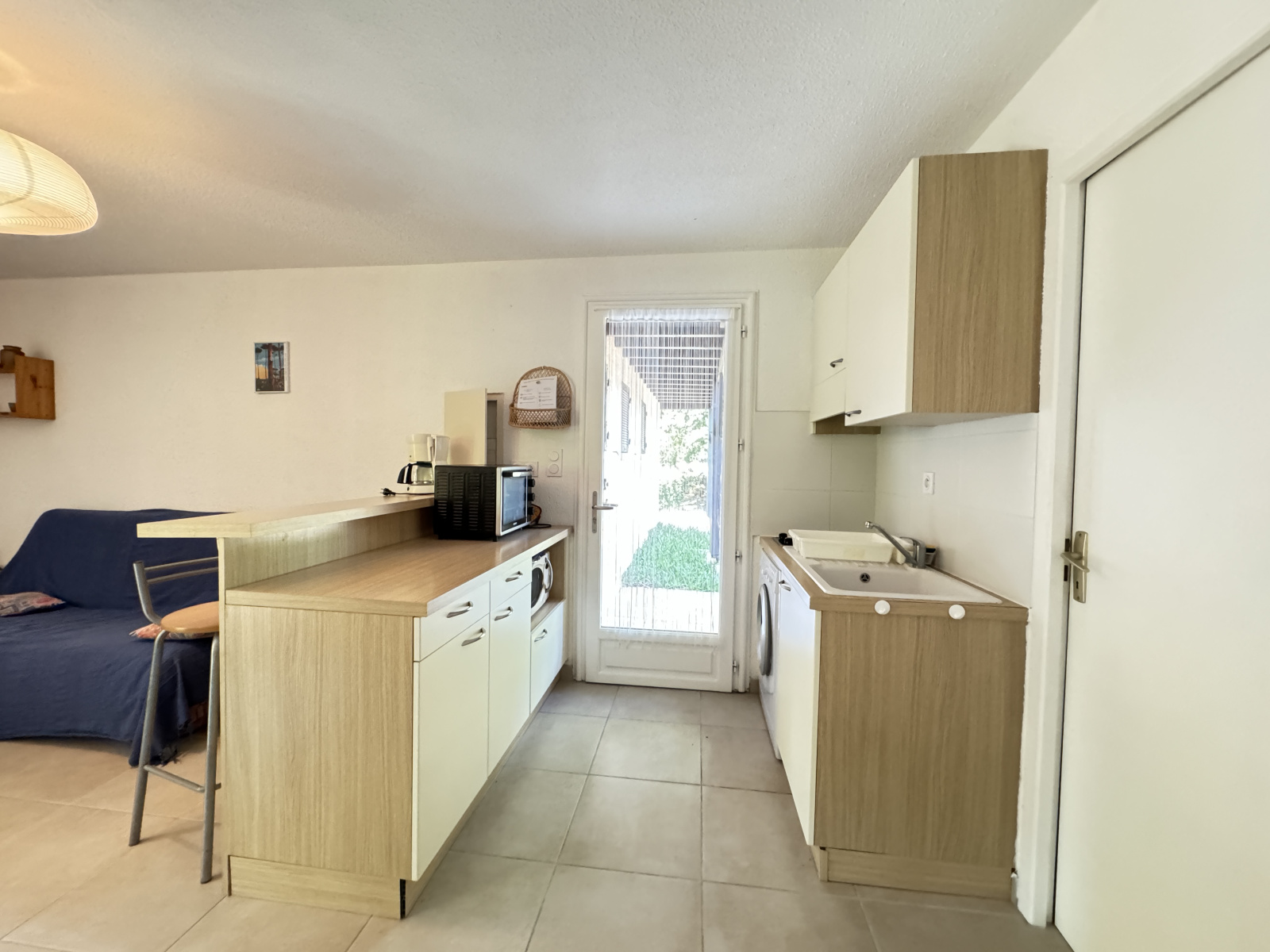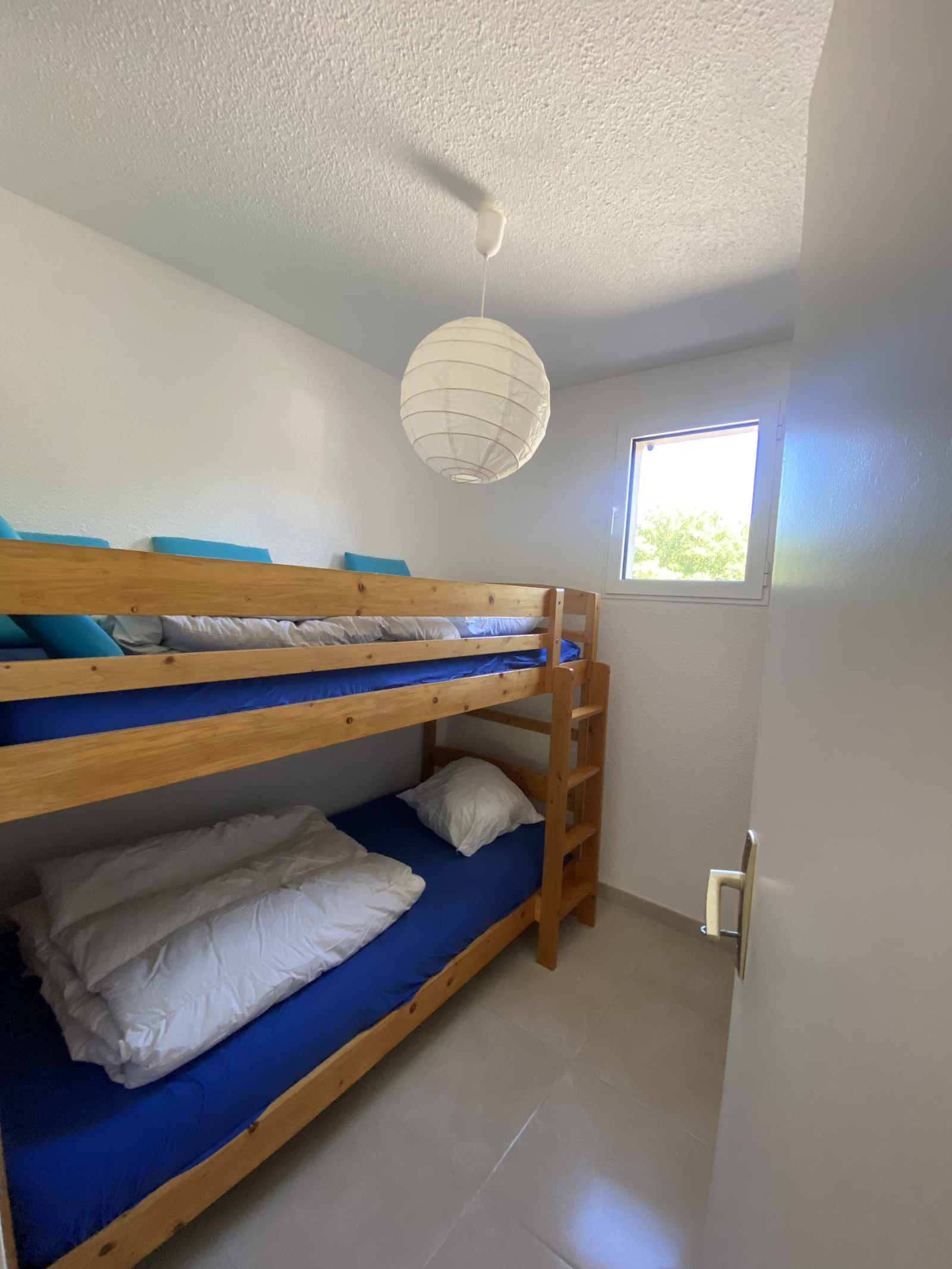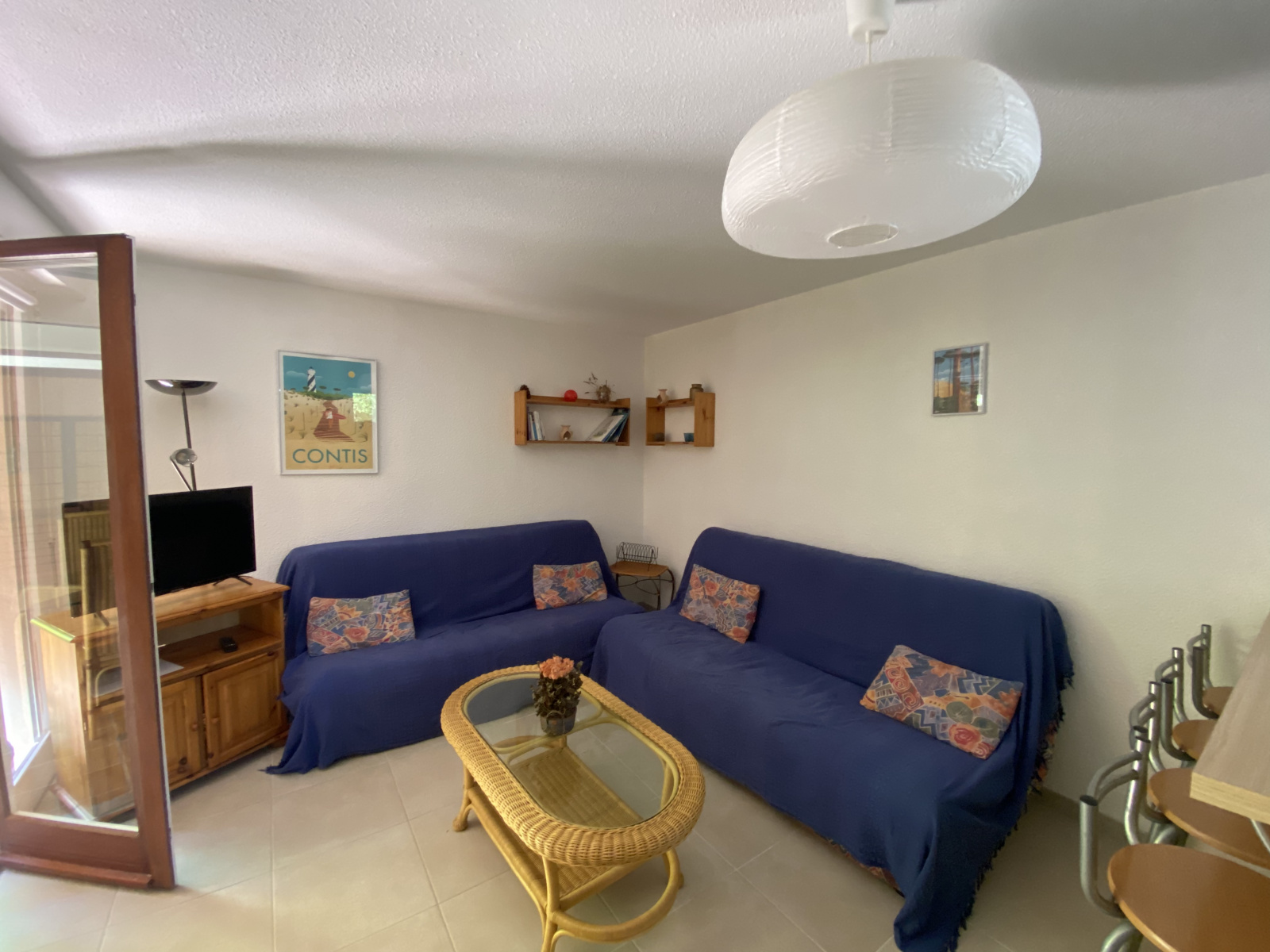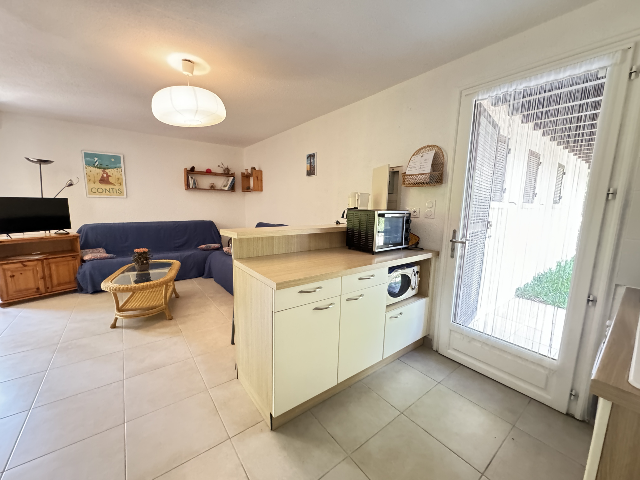 CONTIS PLAGE, résidence Hameau du Pont Rose. Appartement en très bon état composé d'une pièce de vie avec kitchenette, une véranda, une chambre avec lit en 160, une chambre avec lit superposé. Terrasse et jardinet privatif. Place de stationnement. Résidence avec tennis.