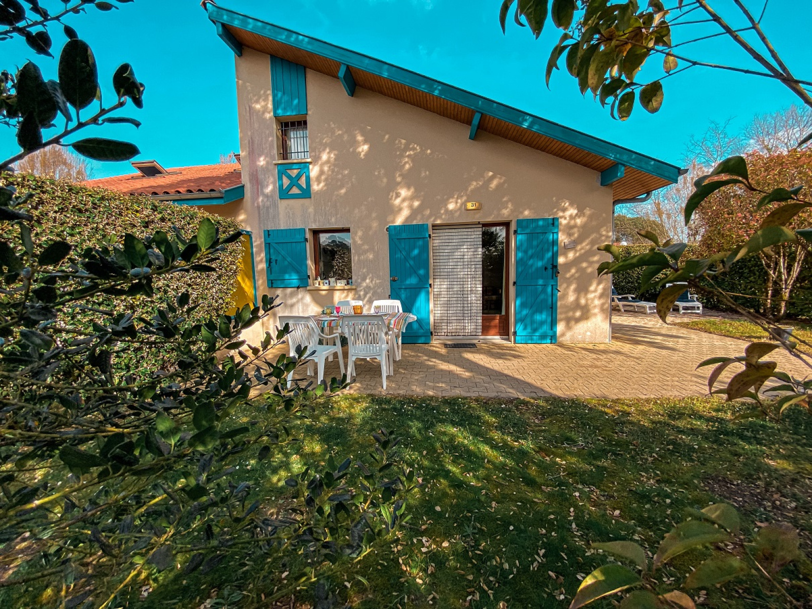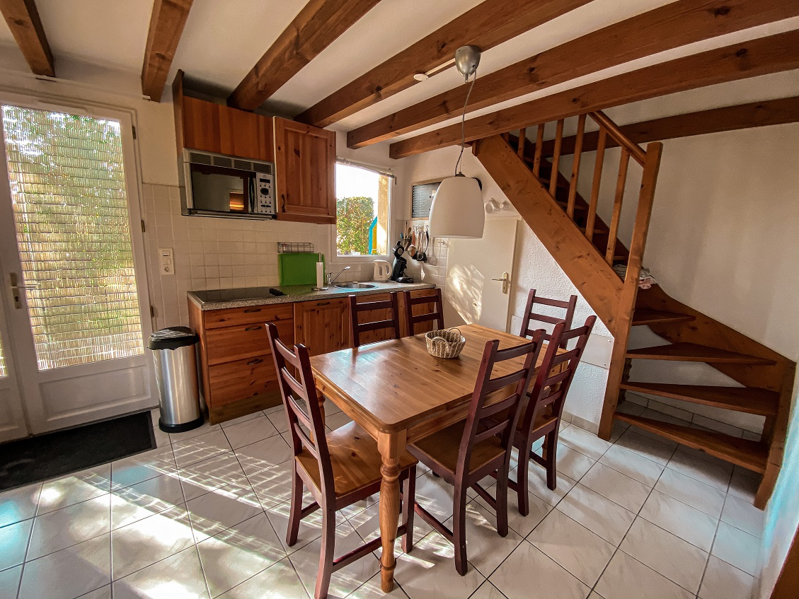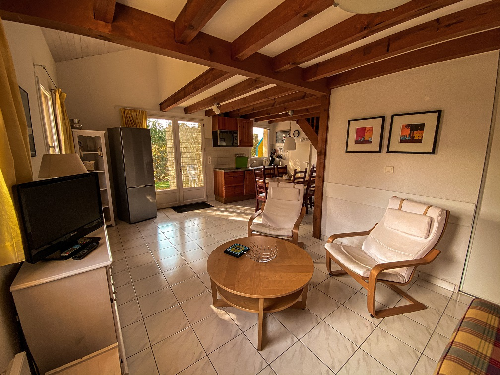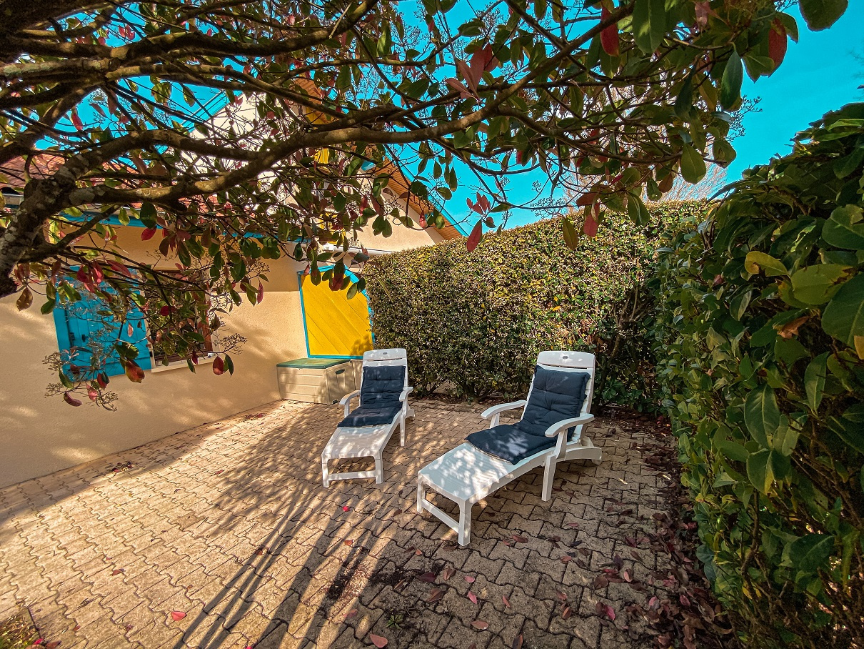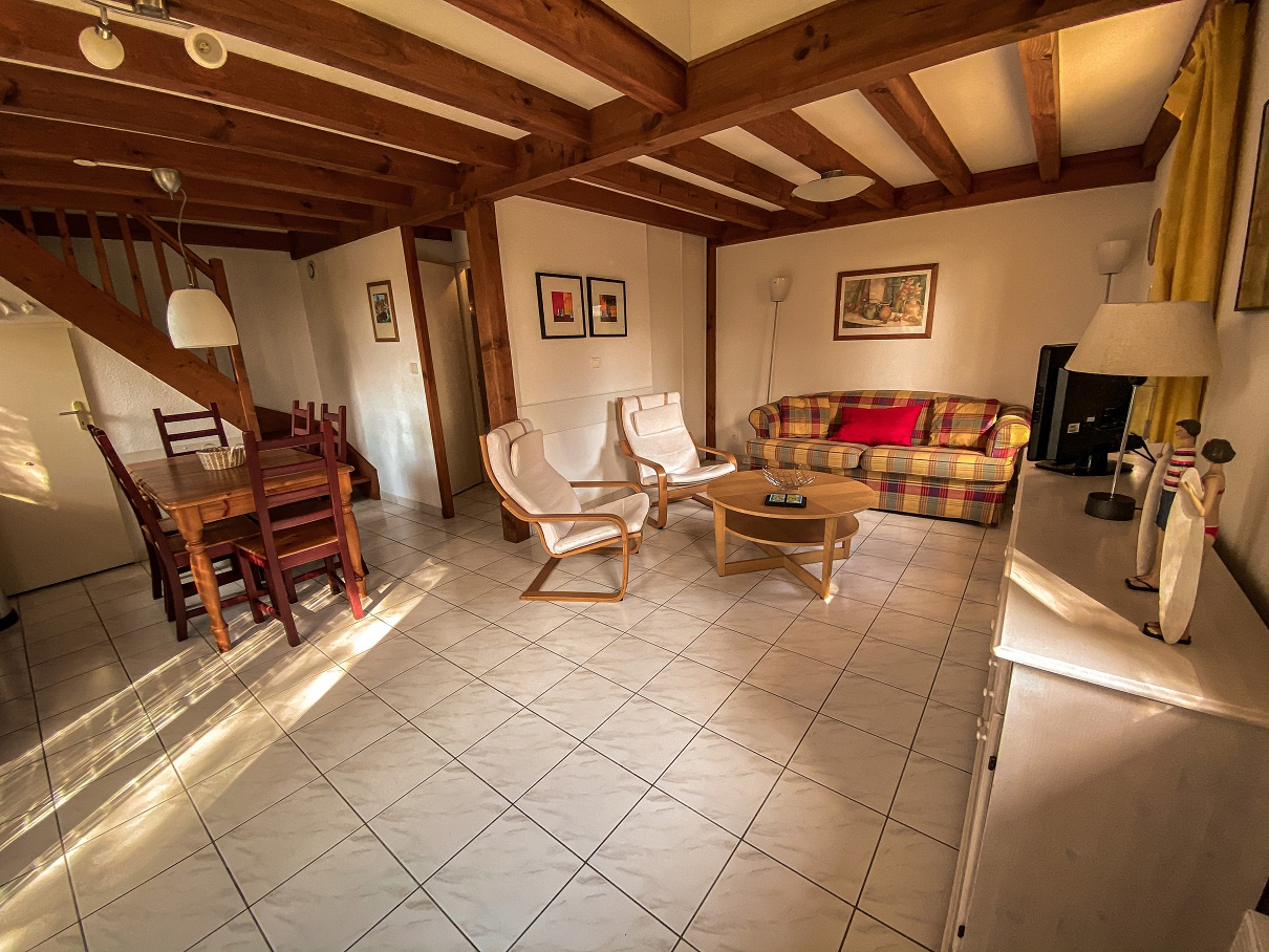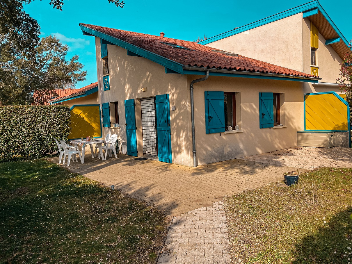 Dans résidence de vacances avec piscine, tennis, maison duplex avec terrasse, jardin, vue dégagée, sans vis à vis. Elle est composée au RDC d'un séjour avec cuisine US équipée, salle de bain et WC séparés. A l'étage 2 chambres avec des lits en 90/200. Canapé convertible dans le séjour. Idéal pour des vacances en famille. Commerces tout proche, plage à environ 7 kms (navettes gratuites juillet/Aout) pistes cyclables pour se rendre en toute tranquilité à l'océan. Possibilité de réserver vos vélos pour votre arrivée.