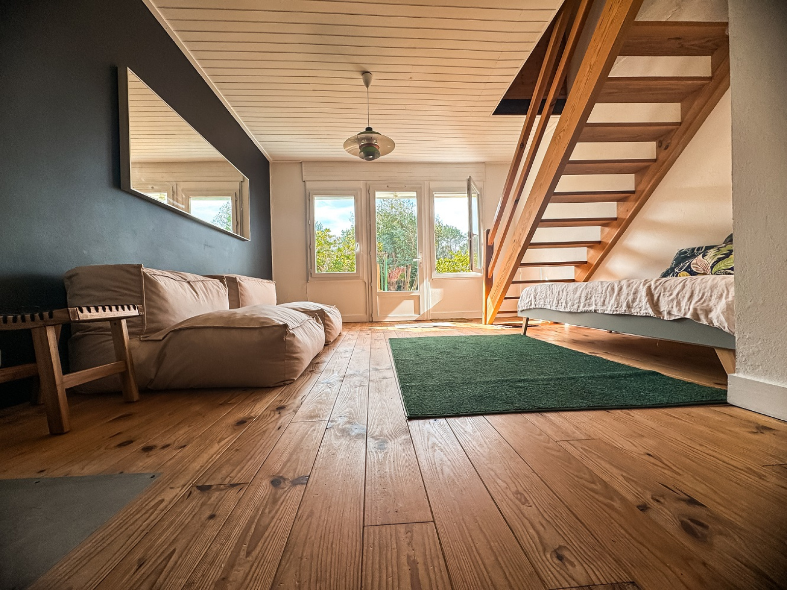 En rez-de-chaussée, vous trouverez un salon ouvert sur la salle à manger et la cuisine, un espace lumineux et traversant avec terrasse au sud et terrasse au nord. Une salle d'eau et un WC.