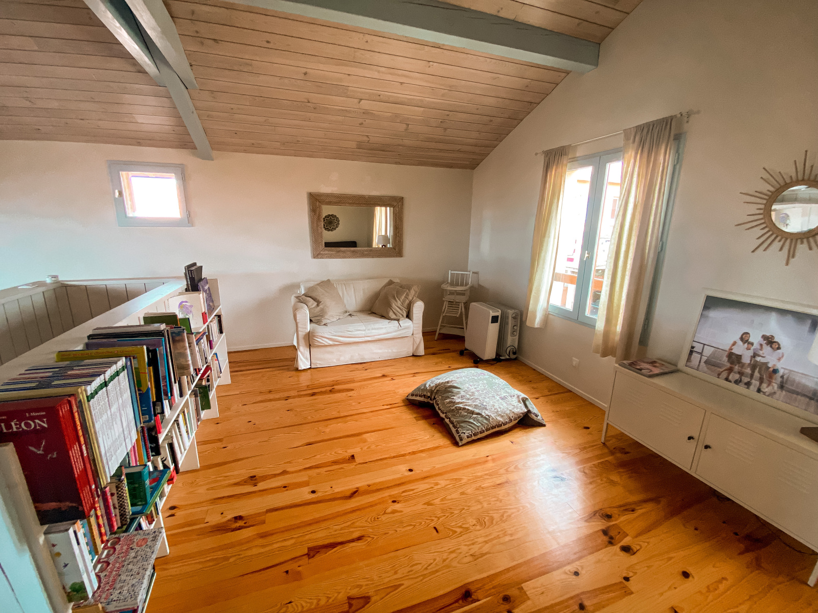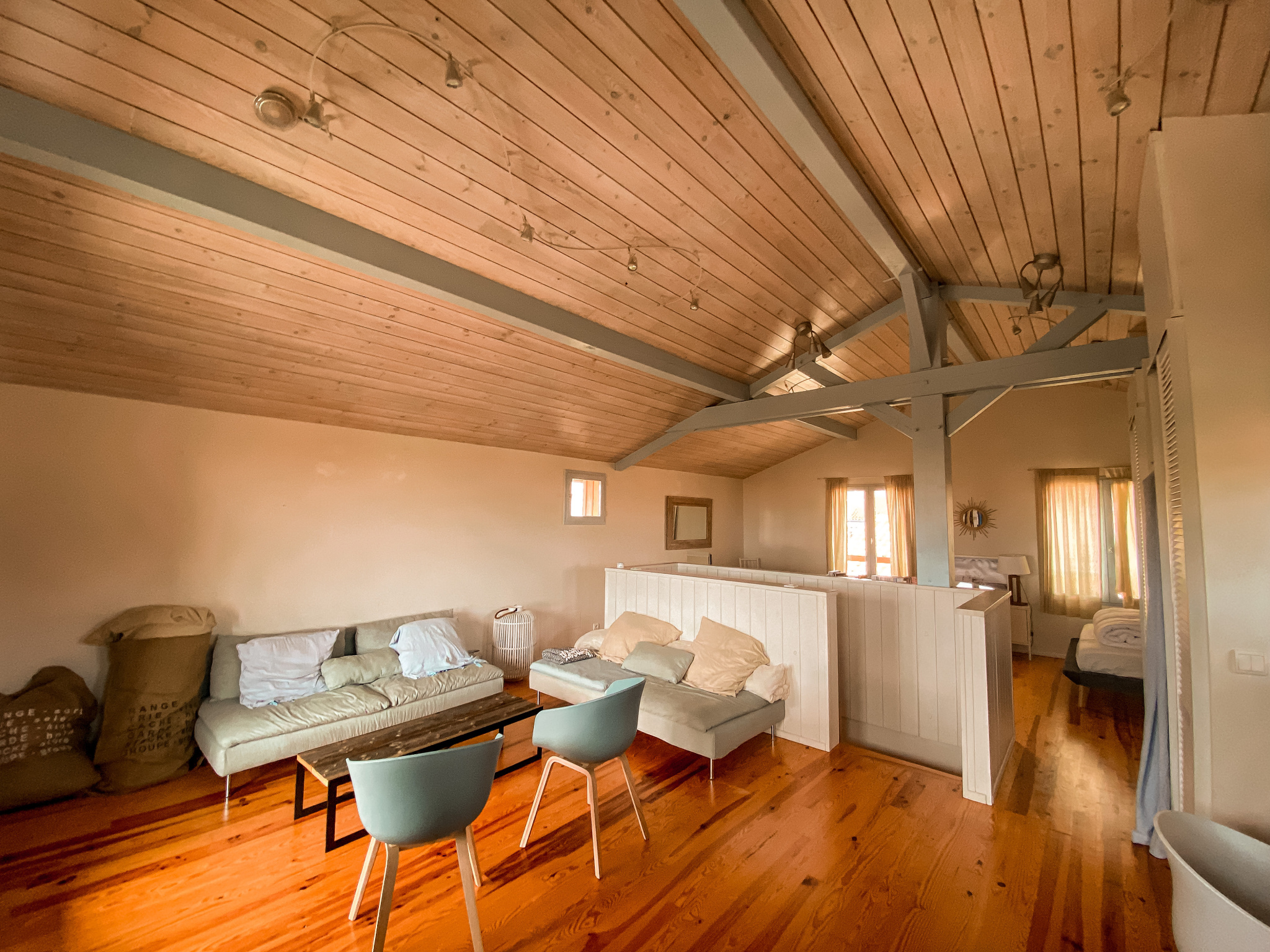 À l’étage : une belle suite parentale avec salon, bureau, salle d’eau et WC, dans un espace ouvert et lumineux
