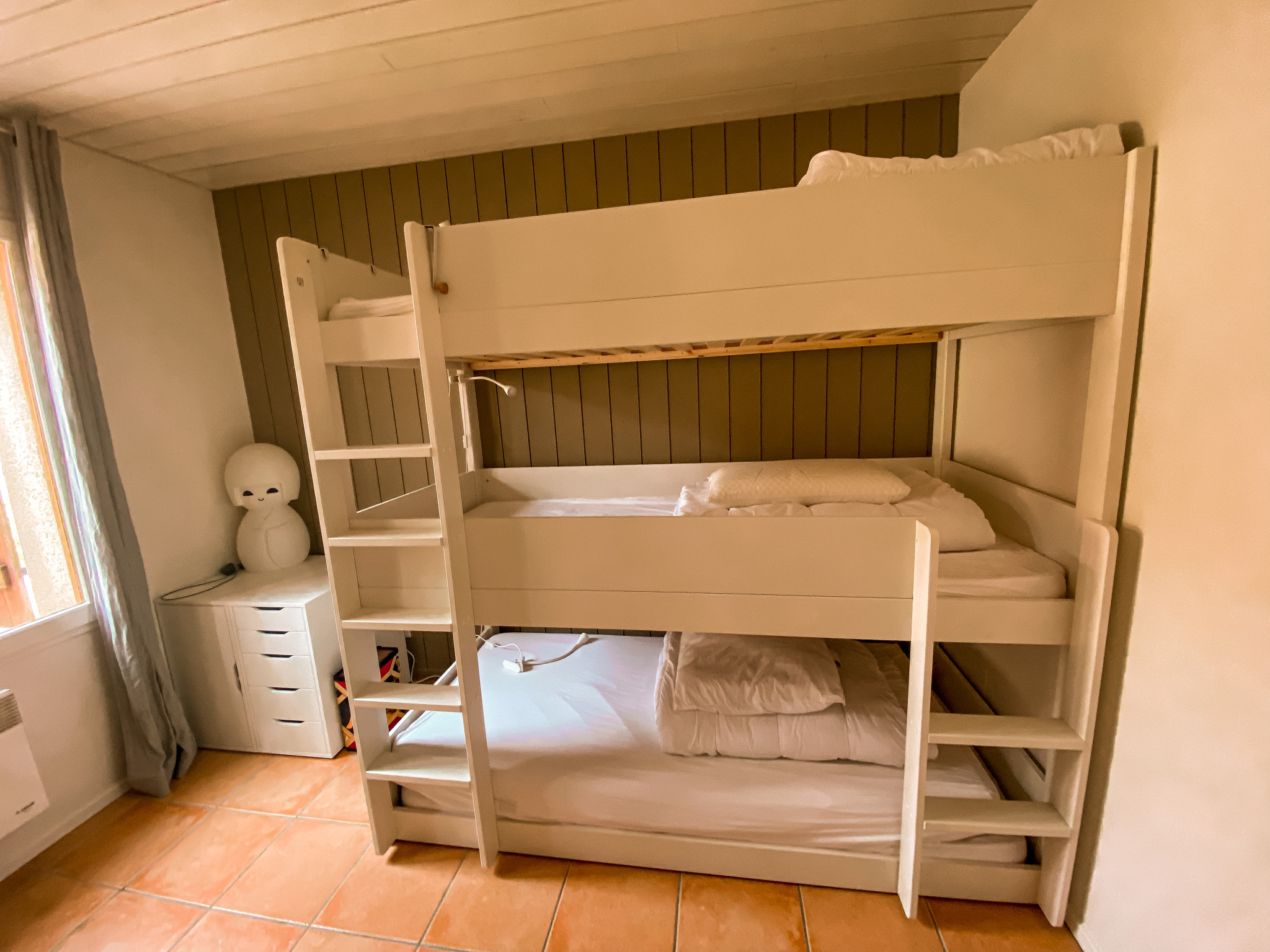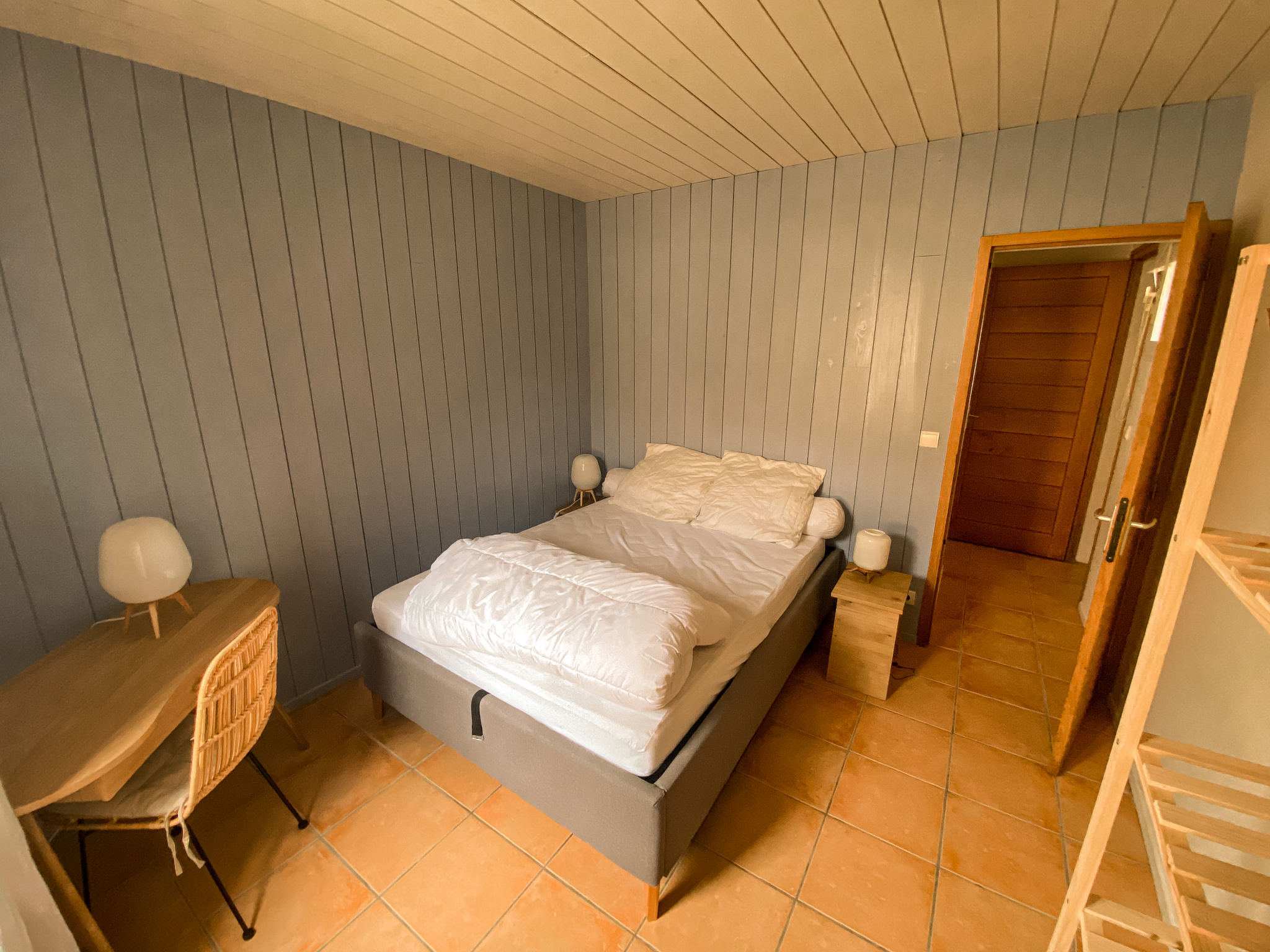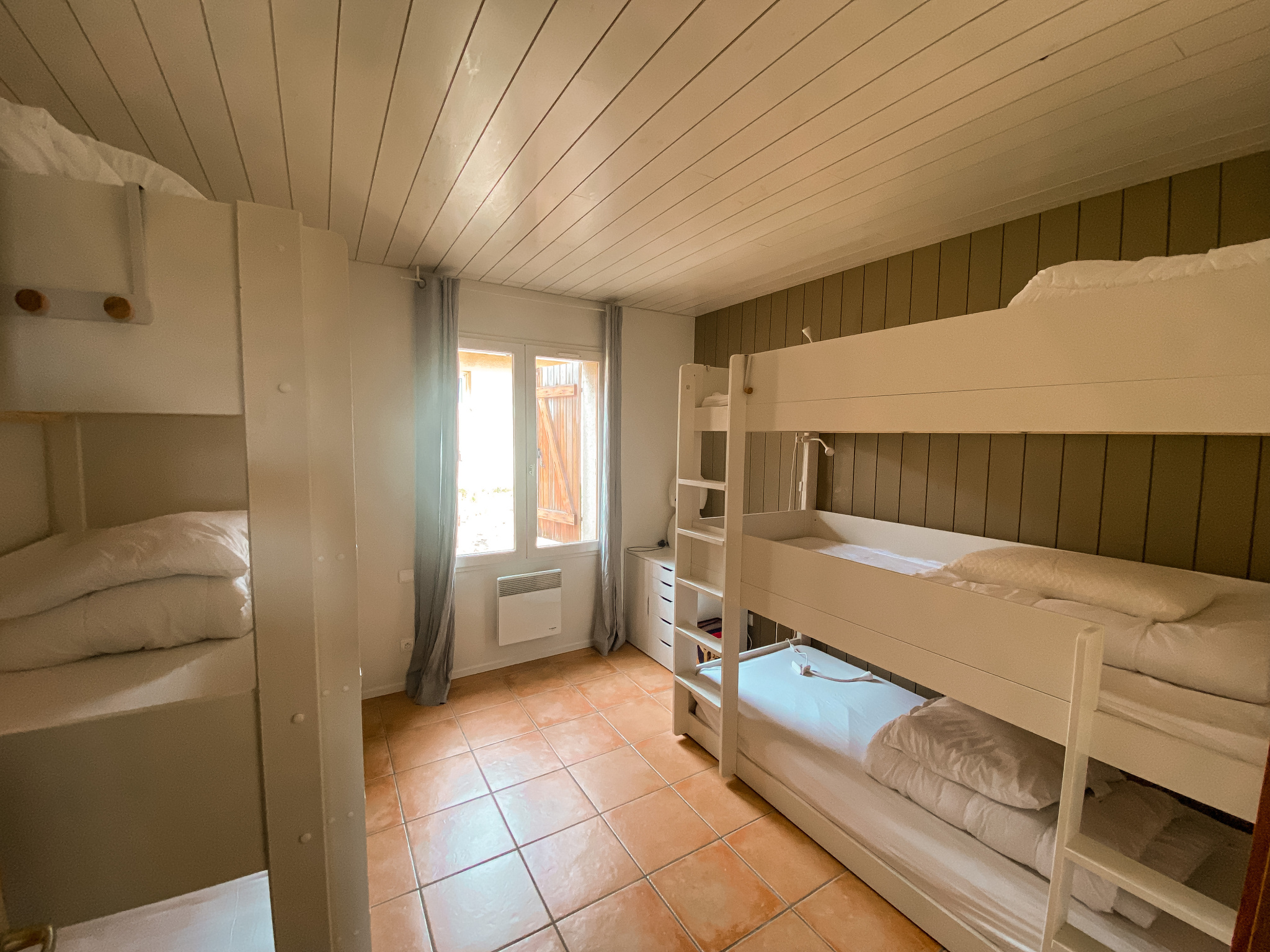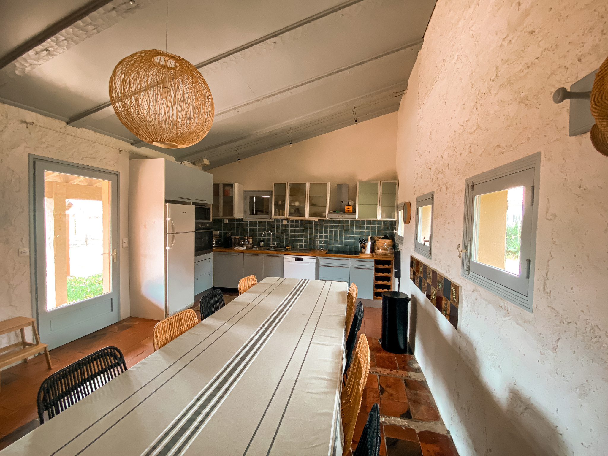Rez-de-chaussée : une vaste cuisine équipée avec espace repas, 3 chambres avec lits doubles, 1 chambre-dortoir (6 lits simples), 1 salle de bain, 1 salle d’eau et WC séparés