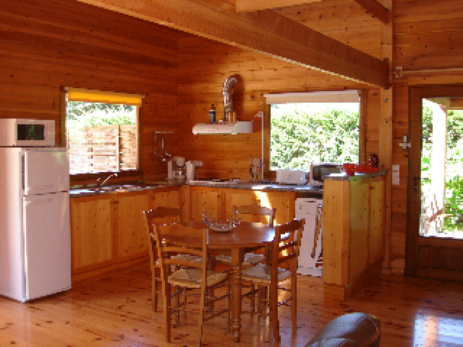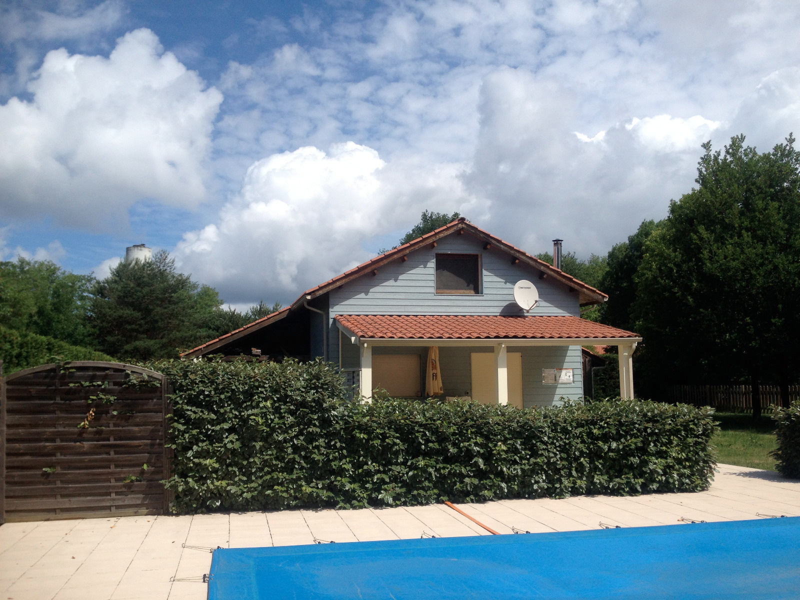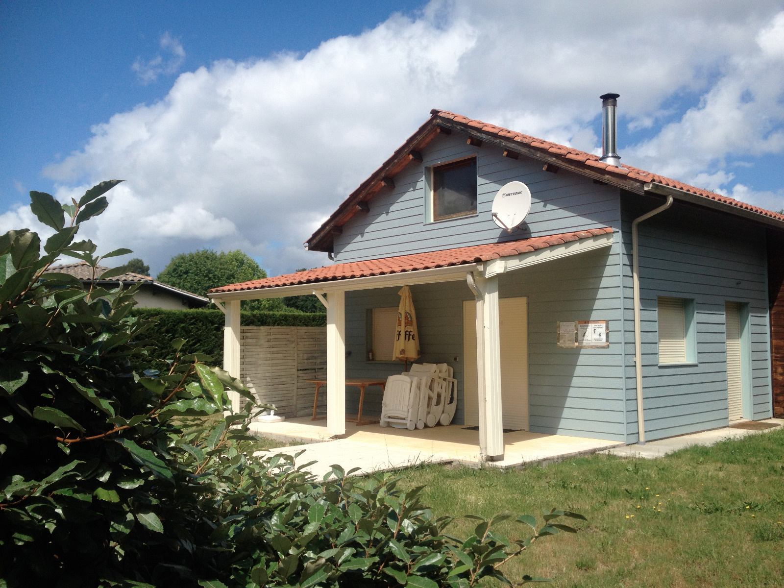 MEZOS - Maison bois avec piscine sécurisée composée d'une pièce de vie avec cuisine us équipée, chambre avec lit en 160, salle d'eau et wc indépendant. A l'étage mezzanine, chambre avec 2 lits de 90 et lit superposé + lit bébé. Terrasse couverte. Abri voiture. Jardin privatif. 2 vélos sont à disposition.