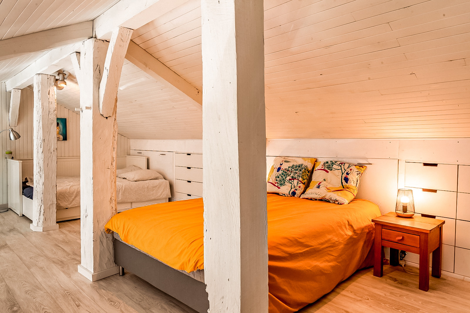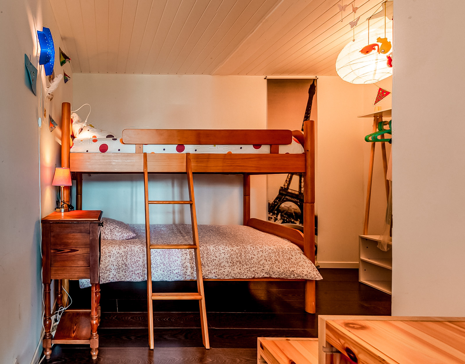 L’espace nuit est constitué de trois chambres, dont deux aveugles, ainsi qu'une suite avec salle d’eau et WC. Une mezzanine astucieusement aménagée en chambre dortoir, une seconde salle d'eau et des WC séparés viennent compléter.