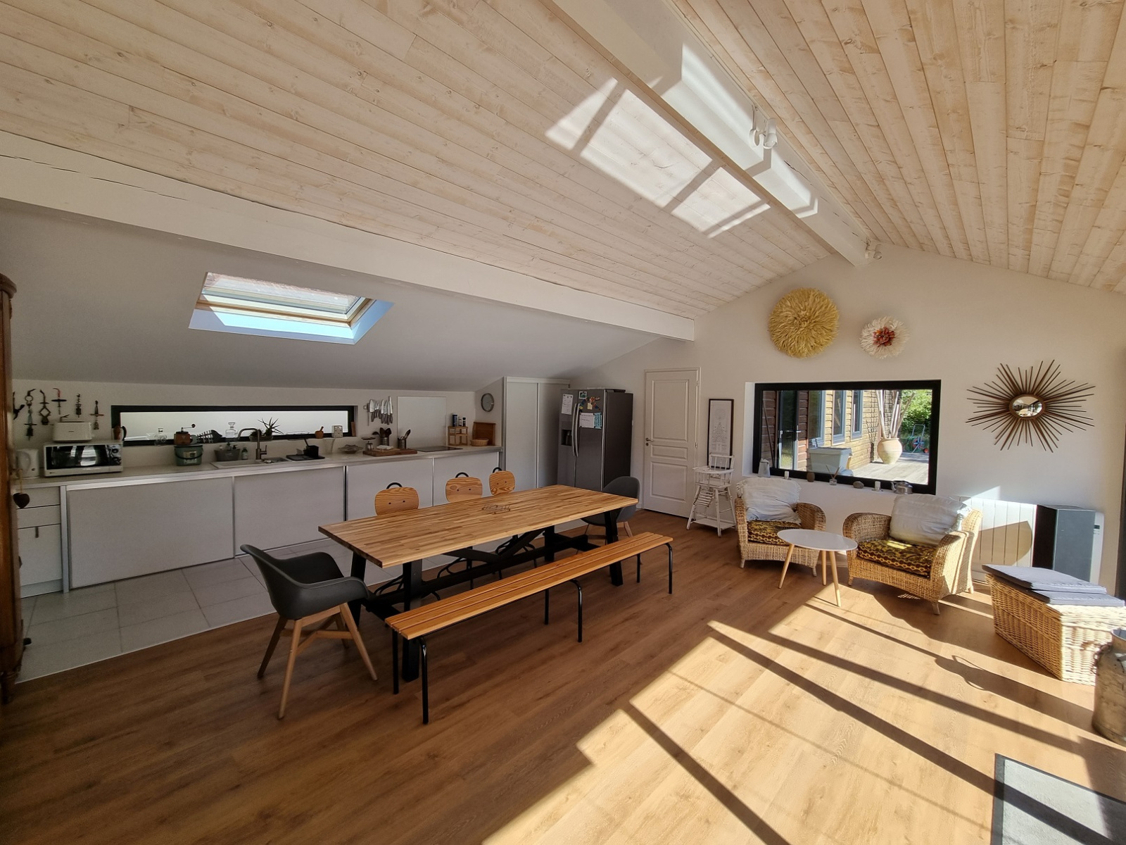 Dès l'entrée, vous serez séduit par un salon spacieux et lumineux de 50m², mettant en valeur une charpente authentique. En complément, l'espace jour se compose d'une cuisine ouverte sur une grande salle à manger (45m²), baignée de lumière grâce à une baie vitrée de 7m offrant une vue imprenable sur une grande terrasse bois avec sa pergola.