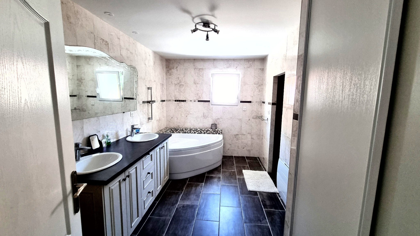 Une grande salle de bain avec douche à l’italienne, baignoire d’angle et double vasque,