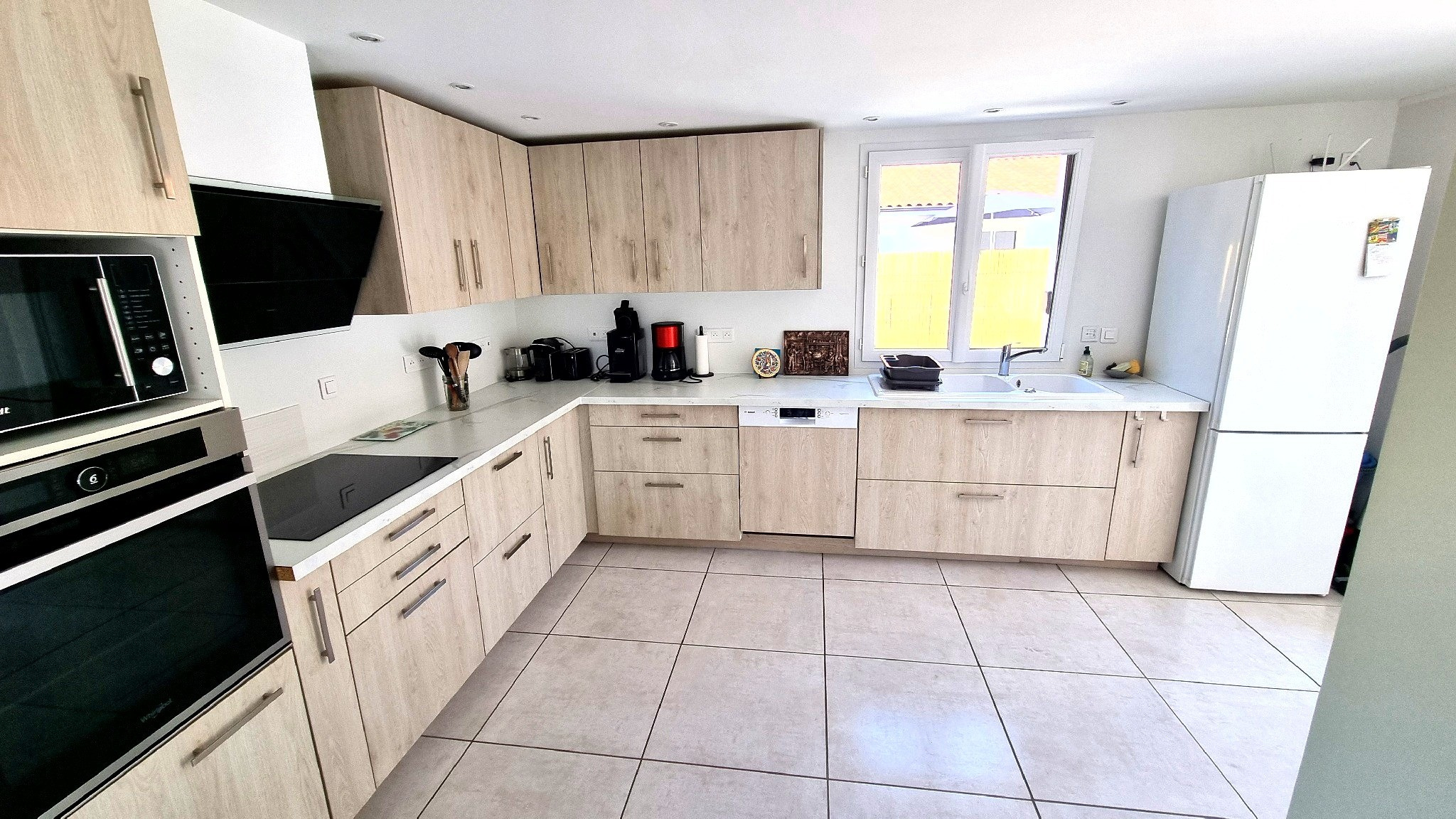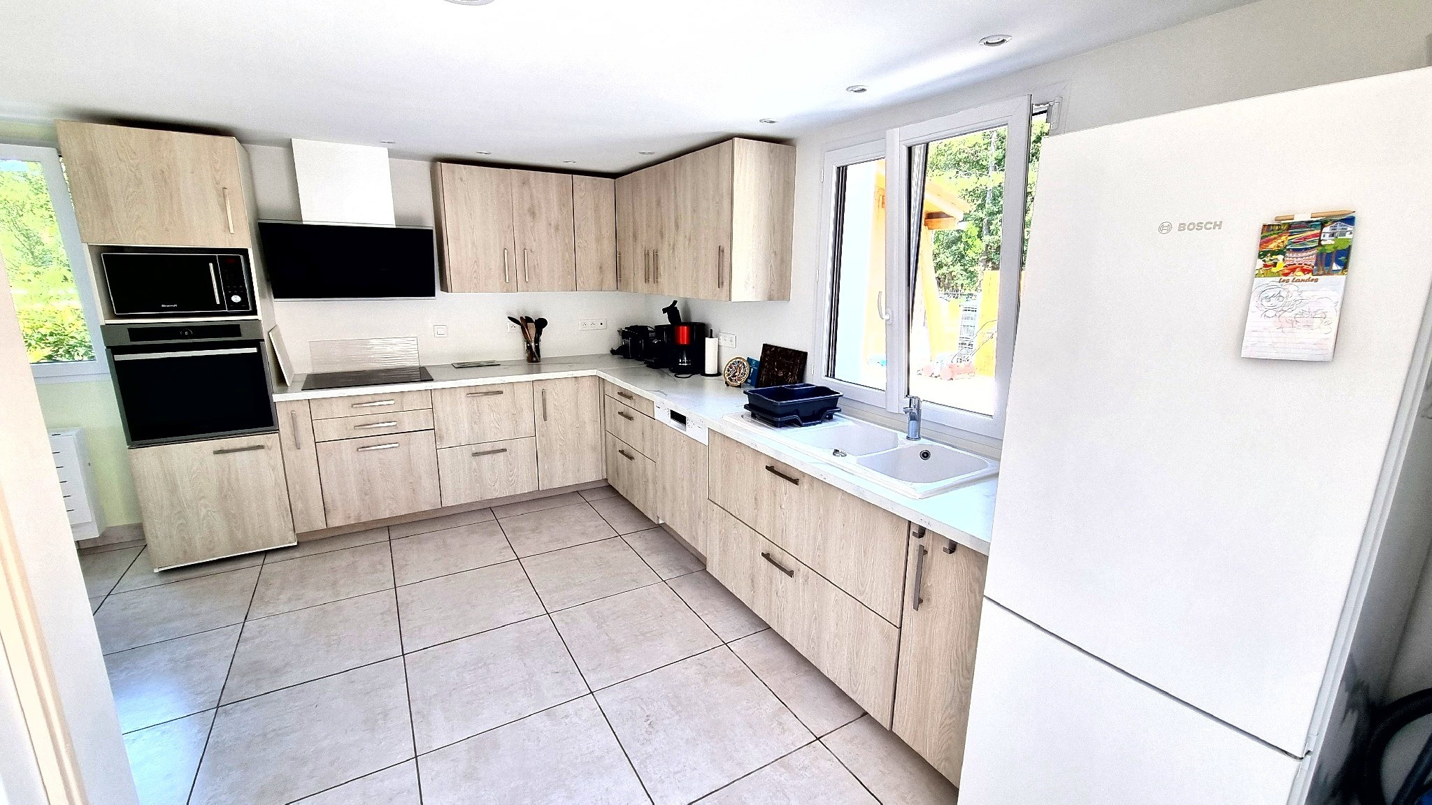 Un vaste séjour lumineux avec cuisine américaine équipée,